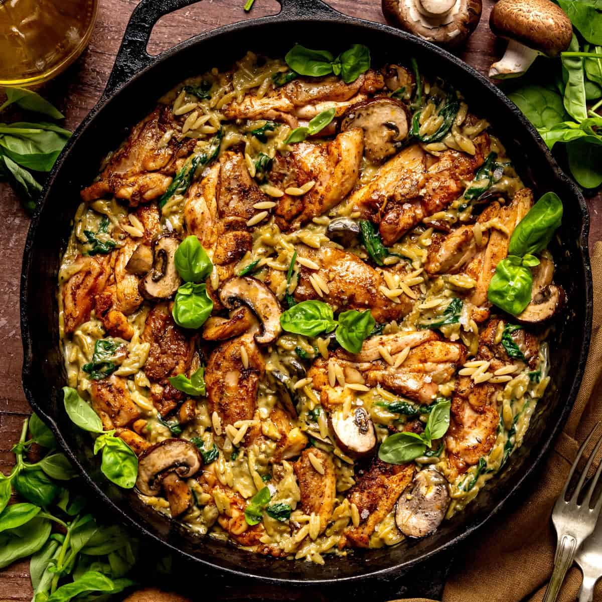One-Pan Creamy Chicken Orzo with Mushrooms and Spinach