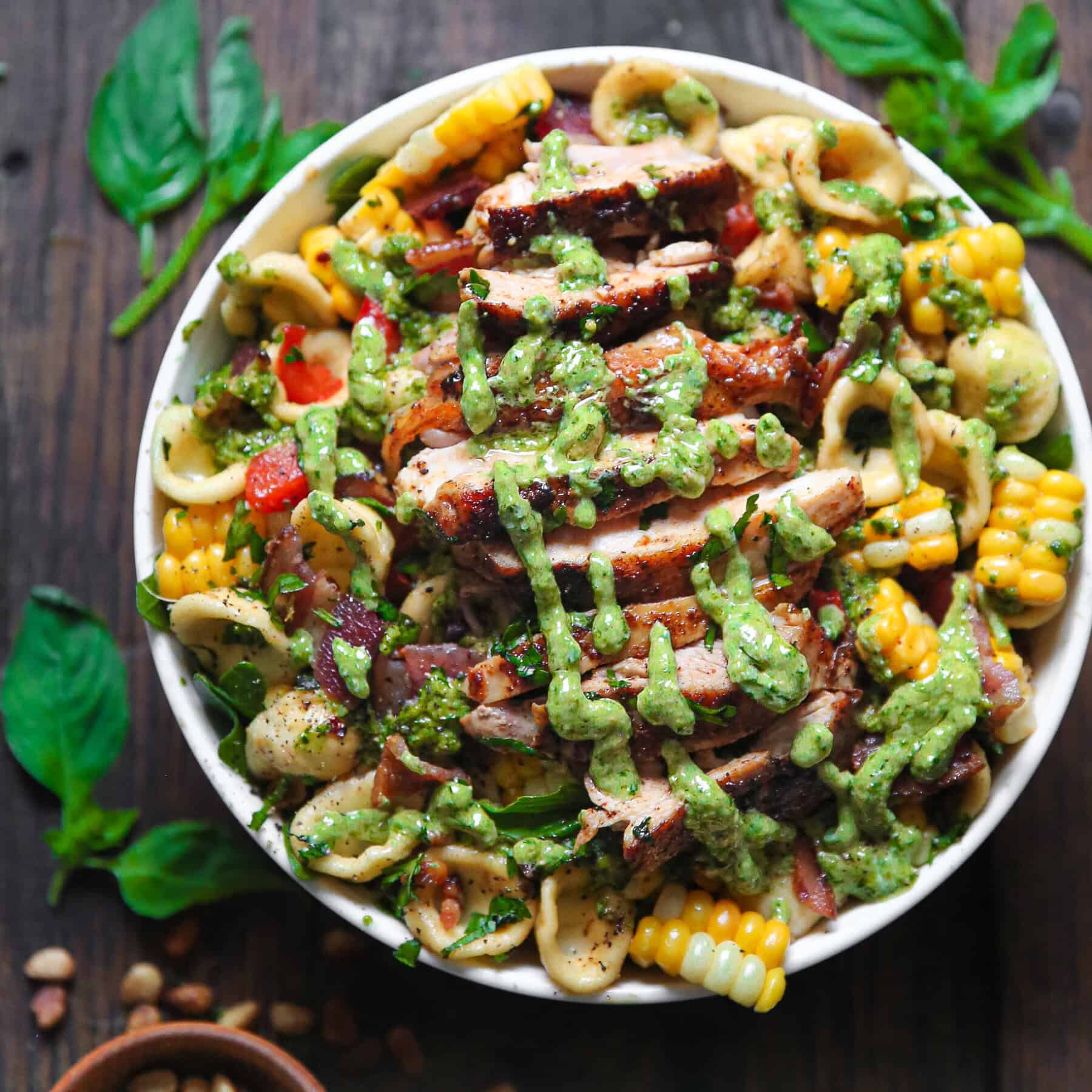 Corn, Tomato, and Spinach Salad with Creamy Pesto Dressing
