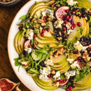 I'm a salad lover through and through, and many of you follow me for fresh, seasonal, restaurant-quality salads - so I'm always creating new ideas that work year-round. This pear salad checks every box: crisp pears, toasted walnuts, creamy blue cheese, and juicy pomegranate, all tossed in a Champagne honey-mustard vinaigrette. Use any greens you like - mixed, arugula, or spinach - because it's super flexible and super easy, the kind of everyday healthy salad you can throw together fast. It also makes a great addition to your holiday menu for Thanksgiving and Christmas. If you're building your holiday spread, don't miss these 3 reader favorites: Apple Spinach Salad, Fall-Colors Cinnamon-Maple Roasted Butternut Squash Brussels Sprouts Salad, and my Christmas Salad that goes viral every year. And for even more ideas, check out my 30 Best Thanksgiving Salads.